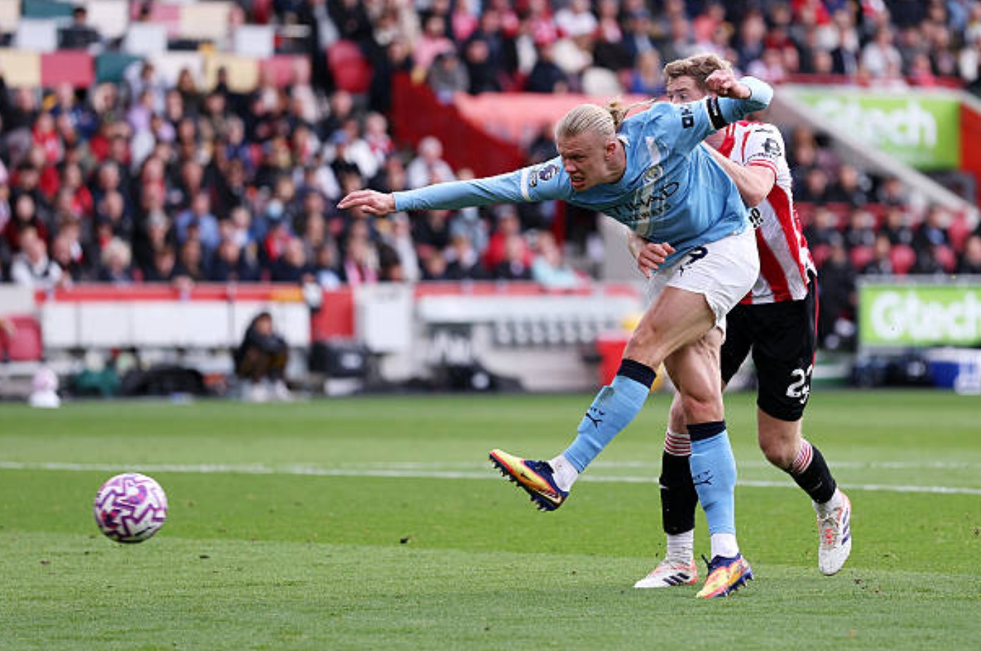 Và rồi như mọi khi, Haaland lại ghi bàn cho Man City. Phút thứ 9, xuất phát từ đường chuyền vượt tuyến của Gvardiol, Haaland cầm bóng đâm trực diện đầy dũng mãnh vào vùng cấm. Anh cài người khôn ngoan để loại bỏ Van den Berg và tiếp tục vượt mặt Collins rồi dứt điểm lạnh lùng tung lưới Brentford.