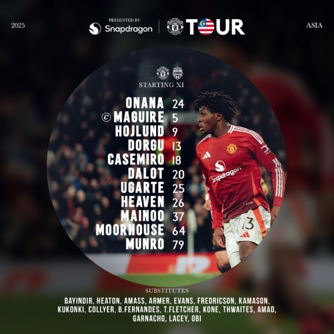 Dù vừa trải qua một mùa bóng rất dài nhưng MU vẫn quyết định tung ra sân đội hình xuất phát khá mạnh trong trận giao hữu với ASEAN All Stars (Các ngôi sao của khu vực Đông Nam Á) với không ít trụ cột của đội 1 như Maguire, Onana, Dorgu, Dalot, Casemiro, Hojlund, Mainoo, Ugarte. Dĩ nhiên trong các trận giao hữu không thể thiếu những gương mặt trẻ: Ayden Heaven – trung vệ sinh năm 2006, Reece Munro – hậu vệ cũng sinh năm 2006 và Jack Moorhouse – tiền vệ sinh năm 2005.
