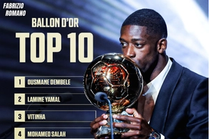 Buổi lễ Quả Bóng Vàng 2025 diễn ra tối 22/9 tại Paris, Pháp đã chứng kiến ngôi sao Ousmane Dembélé được vinh danh ở vị trí số 1 nhờ mùa giải bùng nổ cùng CLB PSG, với cú ăn 4 lịch sử (Champions League, Ligue 1, Cúp Quốc gia Pháp và Siêu cúp châu Âu).