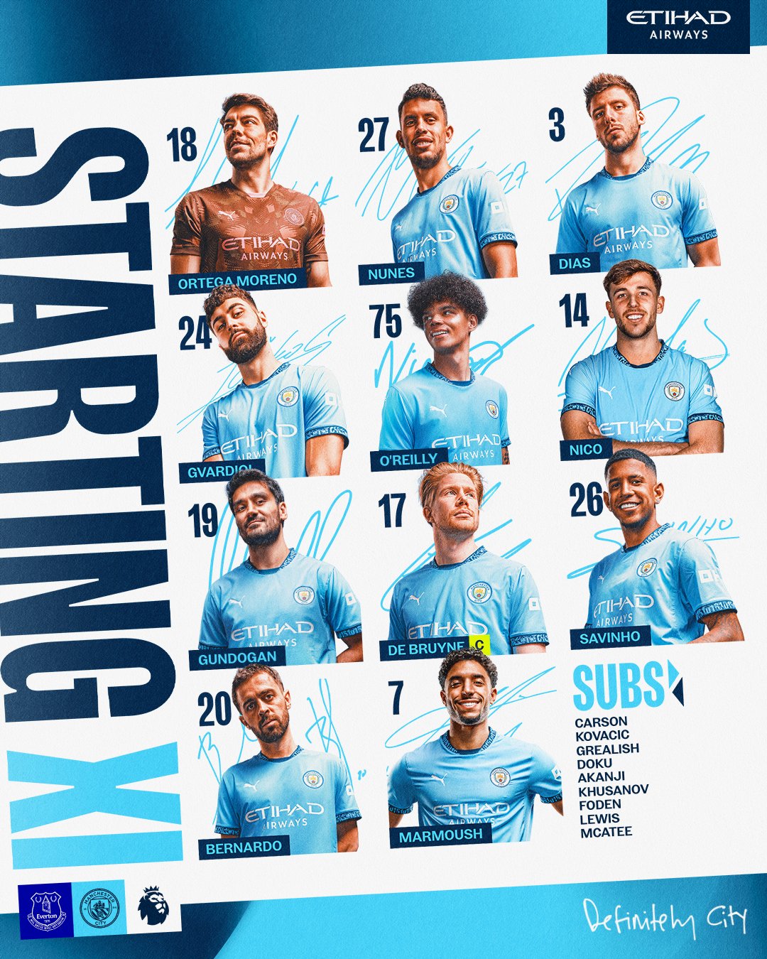 Trước Everton, Man City đã thực hiện vài sự điều chỉnh trong danh sách xuất phát so với trận thắng Palace. Cụ thể Ortega thay Ederson (chấn thương) trong khung gỗ, Matheus Nunes thay Rico Lewis đảm nhận vai trò hậu vệ phải còn Bernando Silva cùng Savinho xuất hiện trên hàng công.